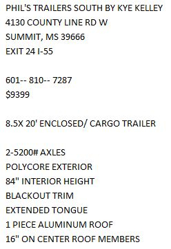 By checking this box I hereby consent to receive customer care text messages and/or phone calls from or on behalf of Phil's Trailer Sales South by Kye Kelley or their employees to the mobile phone number I provided above. By opting in, I understand that message and data rates may apply. This acknowledgement constitutes my written consent to receive text messages to my cell phone and phone calls, including communications sent using an auto-dialer or pre-recorded message. You may withdraw your consent at any time by texting "STOP" or "HELP" for help. See our https://philstrailerssouth.com/privacy for more information.